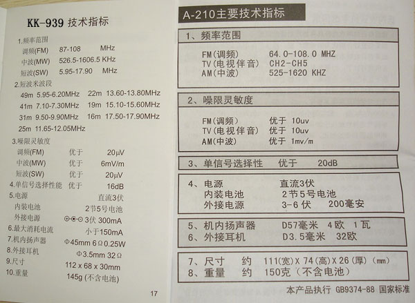 安键的说明书可以说简单明了,采用黑白印刷,总体感觉过大,不够小巧,而且里面的各地频率也有不少的错误,值得改进。凯隆KK-939的说明书就精致的多,大小适中,封皮彩板印刷,中英文对照。一般的用户拿到产品以后首先就要看说明书,在这点上安键做的不够好。