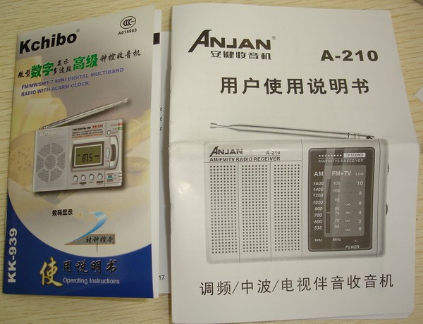 1、 安键A210,机身编号:A0210705000331,出厂日期:2007年6月4日。主要功能:调频/TV伴音CH2-CH5/中波。