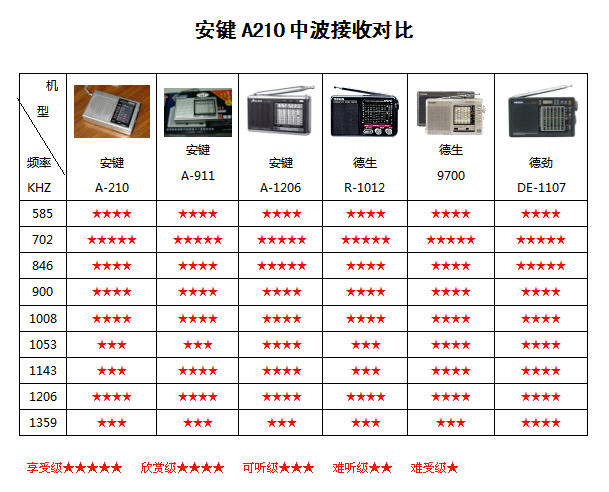 笔者选择了安键二次变频A-1206和同档次A-911,同时又选择了德生的体积相近的老产品1012和9700,作为终极的PK目标,选择了在收音机爱好者中口碑颇佳的民用终极便携指针机1107作为对比。