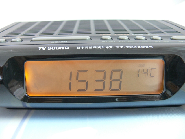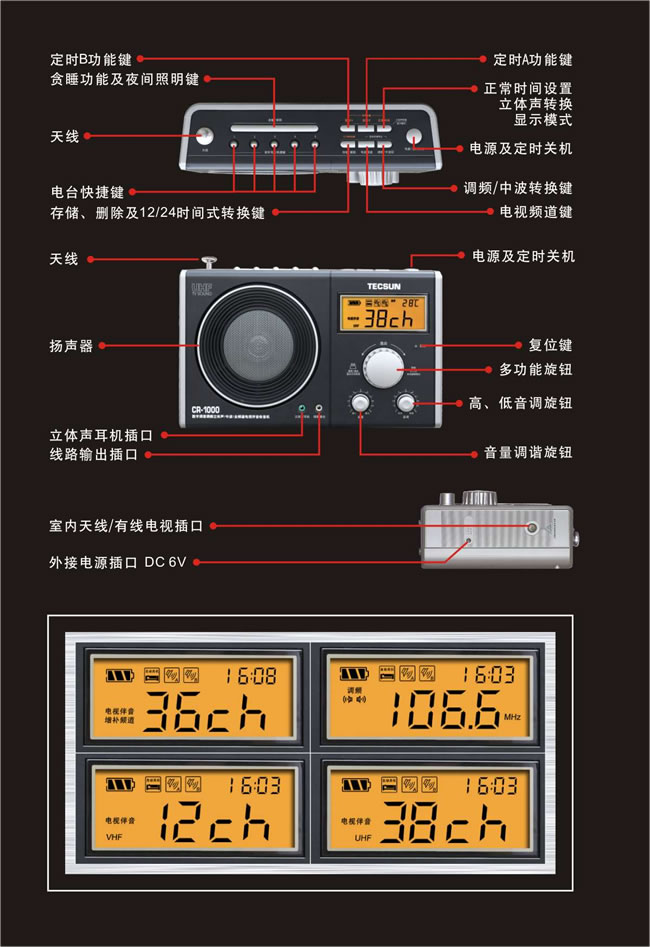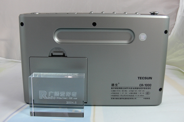 电池盖板为铰链结构,不容易遗失。液晶显示屏采用的是橙色背光,照度均匀柔和!能很容易区分长亮和延时熄灭模式;如果按键时间超过2秒,可以发现背光瞬间熄灭并再点亮,说明长亮模式启动了。该机具备ATS自动搜索存台功能,对于使用者来说是最简单直观的搜索当地电台一直方法之一!CR1000的天线很有特色,采用了内缩式,可以全部拉出,在全部拉出后可以360度的旋转,天线帽圆大,漂亮!机器有贪睡按键,对于喜欢睡懒觉的朋友来说不错的一个功能!有2组开机设置:定时A和定时B,设置相当方便!CR1000可收电视伴音VHF(1-12频道)/UHF(13-57)/有线电视伴音(1-38频道)/调频(立体声)/中波电台节目,当想接收电视伴音时,只需轻轻的按下顶部的“电视频道”键即可,能接收全部的电视伴音,调谐时我一般是先把电台和电视频道搜索一遍,保存好,在收听时只需按一下飞梭,就能轻松的收听电视伴音或调频及中波!作为收音机业界老大的德生,它研发的每款机器都是令人满意,都是各有特色!这款CR1000也不例外,灵敏度确实不错,由于该机是电视伴音为特色的收音机,因此不带短波接收,在接收中波和调频时效果令人相当的满意!该机还有一个温度显示功能,在经过和家里别的温度计及我的胜利数字表的温度档比较,该机的温度显示是相当精确的!