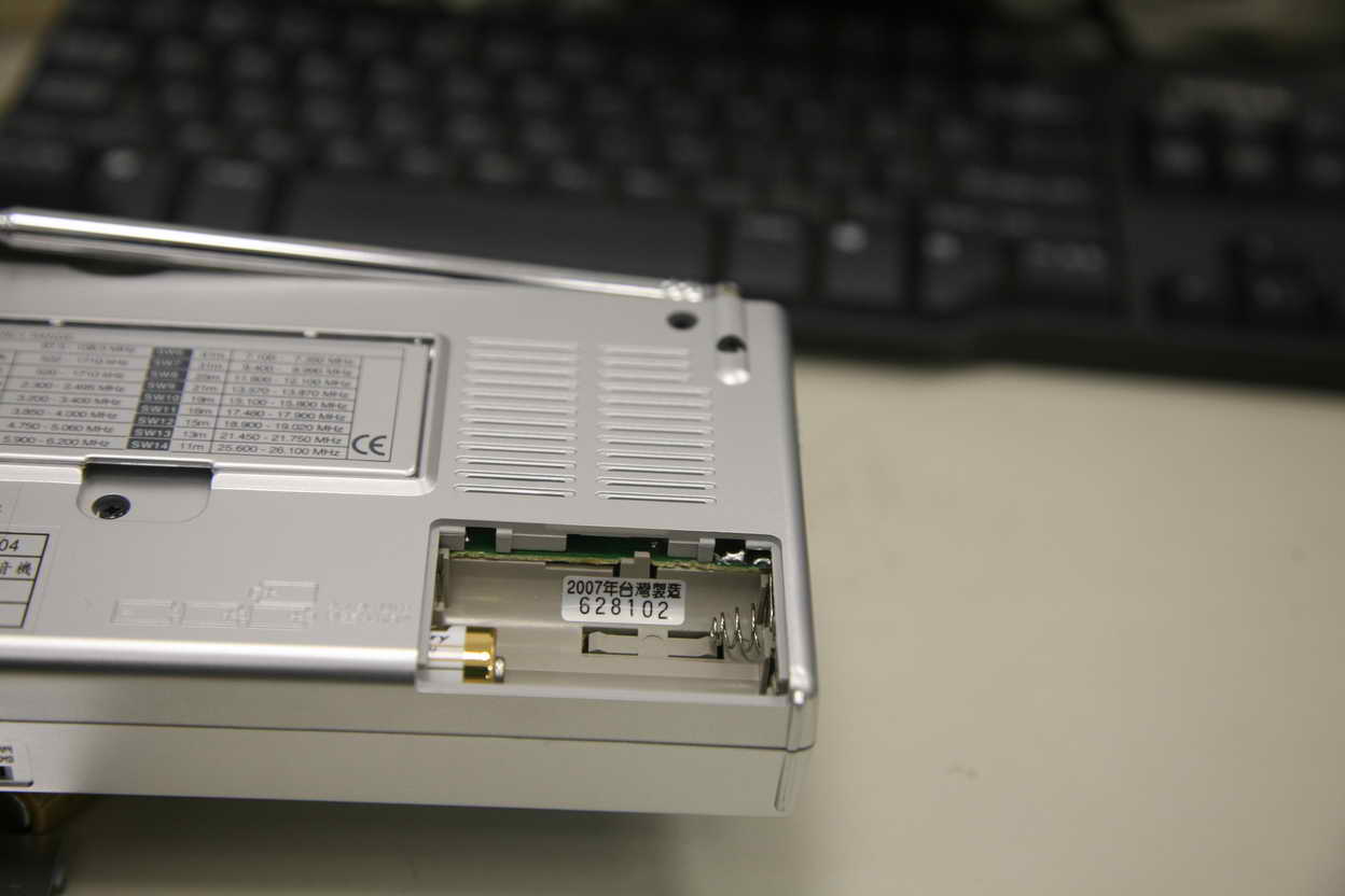 此机需要四节五号电池驱动,摆放类似PL550,为上一下三搭配,打开电池盖,里面有一标签,“2007年台湾制造”序号是628102。标签下还有一个复位按钮,当机时可用。