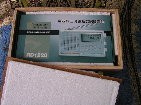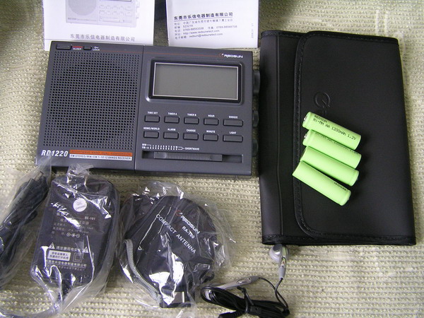 今天收到快递公司送来的乐信RD1220,感到十分高兴,尤其对于乐信产品的优质包装,保证了到手的RD1220完好无损。首先拍照留念后打开包装,RD1220展现在眼前,它的外观给人以稳重的感觉,机壳做工比RF1210要好一些,手感很好,体积比DE1103要稍微大一些,附件有耳机、外接电源充电器、1200毫安时的4节工包充电电池(赠送品)外接天线(5米)、塑胶材料做的机套、说明书及产品保修卡合格证,我这台机器是9月29日生产的。