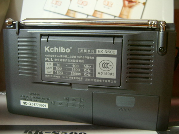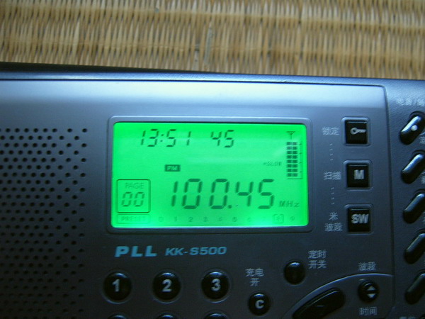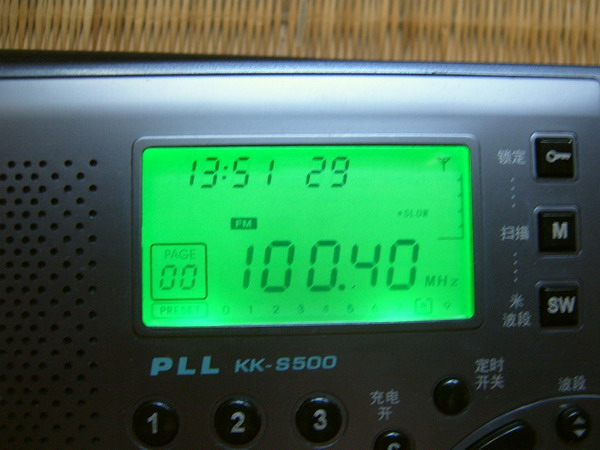 经过10多天的焦急期待,无数次在单位传达室前徘徊,终于盼来了KK-S500.急切打开包装,发现面板材料与DE1103几乎相同,做工很精细.看得出凯隆的用心良苦,看图:![]() ![]() ![]() ![]() 包装风格如同9510HF以及KK-S50L,附件除了多了3节工包2300mah的充电电池外,其余与9510HF一样,不过大家可得注意了,外接电源与原来凯隆一贯的外界电源正负极正好相反(与DE1103、1104一样),内正外负;另外附送的皮套很时尚,粗粗的缝合线与棕色的皮质搭配很好看。 ![]() ![]() 一、几个领先或首次采用 1、同步检波:本机的亮点与卖点,相对于KK-9510HF,又多了上、下边带。可惜的是没有SSB。否则专业机子的称号更加相称。 2、飞梭:其实国产机子已经开始广泛使用了,现在已经成为数调机子一种流行趋势,可是旋钮在正面的除了HAM2000,大概在便携机子中KK-S500是第一个吃螃蟹的; 3、万年历,星期同时指示:在数调机子中同时使用也是开创了先河,如果不是DE1104率先出炉,可以说创下多个第一; 4、开机后时间显示至秒:可能是第一家这样做的 5、大容量存储:1000个存储位置,与DE11、DE1105一样领先,掉取存储电台的方便性各有千秋; 6、调频的频率输入可以精确到0.01MHZ,已经有多家采用了,对于凯隆来说,大姑娘上轿头一回,鼓励一下; 7、中短波可以模糊输入,波段自动切换:如在中波波段输入11785,按下F确认键即可自动切换到短波波段。 8、说明书采用套彩印刷也表扬一下。也是首创。 二、操控 实话实说,如果一台收音机没有说明书,自己去摸索,感觉德生在面板上的交代最清晰,我习惯不看说明书去操作,主要是防止工程师的要求禁锢了手脚,通过2天的使用感觉凯隆在这款机子上上下了很大的工夫,交代的很不错。 但是最初唯一感到麻烦的是“F”键,如果从未用过数调机子就会感觉很难理解,其实它就相当于德劲夏工喜欢用的“ENTER”,但也有些不同。这个键在凯隆的这款机子中起着重要作用:输入电台频率先后都要按,先按表示输入,后按一次表示确认。修改日期时钟等信息也要在最后按F键表示确认。 正是因为F键的强大作用,所以我认为小数点键“• ”多余,因为只有调频用到小数点,但是F键可以自动修正,如调频93.7MHZ,只要在调频波段按下9、3、7三个数字,按下确认键即可调整为93.70MHZ。 三、收听报告 既然大家都盯上1103与KK-S500的对比我也就听大家的,手头没有PL550,就让PL350也跟着凑热闹。 1、调频(步进:快速0.1 昨天通过与工程师的沟通,我们2位薪斑竹的机子是出生于即将推出的20台机子之前,属于样机范畴,还有的地方正在改进,例如我的这台调频频率比正常的多了0。05MHZ,图来说明,注意信号强度指示,就可见一斑了。 ![]() ![]() ●表示本地电台或本地转播 ★★★★★表示收听效果最佳 ★★★★☆表示收听效果好 ★★★☆☆表示收听效果较好 ★★☆☆☆表示收听效果差 ★☆☆☆☆表示可以艰难收听,语音可辩 ☆☆☆☆☆表示不可听 按照频率递增顺序: 频率 电台 KK-S500 PL350 DE1103 87.6 合肥文艺 ☆☆☆☆☆ ☆☆☆☆☆ ★★☆☆☆ 88.1巢湖人民 ★★★☆☆ ★★★☆☆ ★★★☆☆ 88.7铜陵文艺 ★★★☆☆ ★★★☆☆ ★★★☆☆ 88.8安徽生活 ★★★★☆ ★★★☆☆ ★★★★☆ 90.1当涂人民 ★★★★☆ ★★★★☆ ★★★★☆ 90.8●安徽交通 ★★★★★ ★★★★★ ★★★★★ 91.5中央一套 ★☆☆☆☆ ☆☆☆☆☆ ★★☆☆☆ 91.8●安徽音乐 ★★★★★ ★★★★★ ★★★★★ 92.8马鞍山交通音乐★★★★☆ ★★★★☆ ★★★★☆ 93.7江苏居家 ★★★☆☆ ★★★☆☆ ★★★☆☆ 95.1●安徽生活 ★★★★★ ★★★★★ ★★★★★ 95.5安徽新闻 ☆☆☆☆☆ ☆☆☆☆☆ ★☆☆☆☆ 96.3●芜湖交通经济★★★★★ ★★★★★ ★★★★★ 97.1●安徽经济 ★★★★★ ★★★★★ ★★★★★ 97.5江苏文艺 ★★★☆☆ ★★★☆☆ ★★★☆☆ 98.2●芜湖音乐故事★★★★★ ★★★★★ ★★★★★ 99.2●安徽新闻 ★★★★★ ★★★★★ ★★★★★ 100.0铜陵人民 ★★☆☆☆ ★★☆☆☆ ★★★☆☆ 100.4●芜湖新闻★★★★★ ★★★★★ ★★★★★ 101.1江苏交通 ★★★☆☆ ★★★☆☆ ★★★☆☆ 103.6安徽新闻 ★★★☆☆ ★★★☆☆ ★★★☆☆ 104.3南京体育 ★★☆☆☆ ★★☆☆☆ ★★☆☆☆ 104.4安徽音乐 ★★☆☆☆ ★★☆☆☆ ★★☆☆☆ 105.1马鞍山人民 ★★★☆☆ ★★★☆☆ ★★★★☆ 105.8南京音乐 ★★★☆☆ ★★★☆☆ ★★★☆☆ 106.9安徽农村 ☆☆☆☆☆ ☆☆☆☆☆ ★★☆☆☆ 107.1安徽音乐 ★★★☆☆ ★★★☆☆ ★★★☆☆ 初步感觉KK-S500的选择性不错,大家可能注意到88.7与88.8,104.3与104.4 几乎同频通过旋转天线方向都可以辩听,很不错. 2、中波(步进:快速9/10K,慢速1K) 现在中波听的人越来越少了,可是为了测评,还是作了个对比,感觉抗干扰都差不多,我家门口有个门灯,对于测干扰很有用,我经常会用收音机测试它是否忘了关了,发现3者一样都抗不了它的干扰。只是收听几个经常收的电台进行比较没多大差别。差距只有声音解读,不过每个人各有所好。 3、短波(步进:快速5K,慢速1K) 3、短波(步进:快速5K,慢速1K) 由于瞿斑竹先前与1103作了对比,本人偷懒,按照他所提供的时间段及频率进行一一验证。纠正了几个错误 ★★★★★表示收听效果最佳 ★★★★☆表示收听效果好 ★★★☆☆