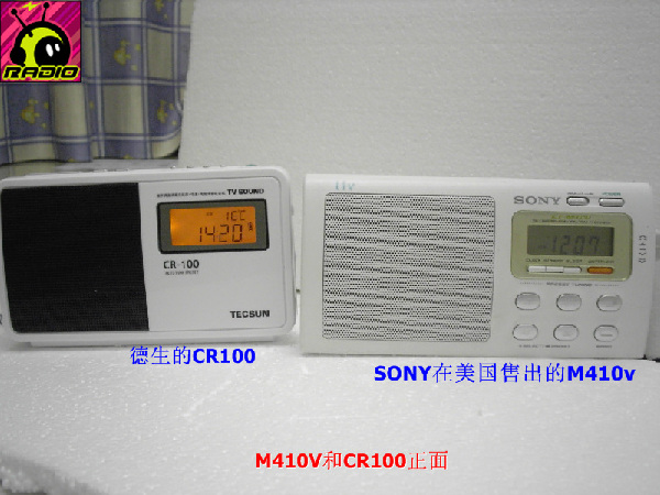 钟控功能,CR100有二个开机,一个贪睡功能,一个液晶背景亮度光,睡眠关机功能。而M410V只能设一组自动开机时间,睡眠关机也只能4档可调。最差劲的是M410V的液晶没有背景光显示!!!如果不开灯,夜晚操作起来很麻烦。其实不是增加这个东西有难度,也许是SONY想让自己生产的钟控收音机来完成这项工作。CR100的耳机输出是立体声的,M410V是单声道的。