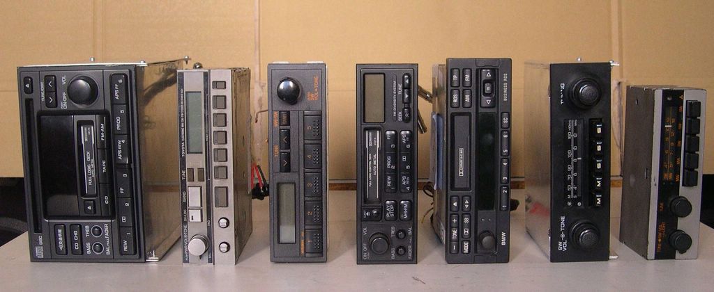 纯收音用的车机,有人管它为收音头。共9台,左起(下同)1-5台为电子调谐,6-9台为机械调谐。第6台很有意思,厚度不足1DIN,只有中波。第8台是较少见的63年产富士车机。丰田,三菱,歌乐是这些车机的主要生产商。虽然年代久远,这些车机依旧可以运行(图2)。