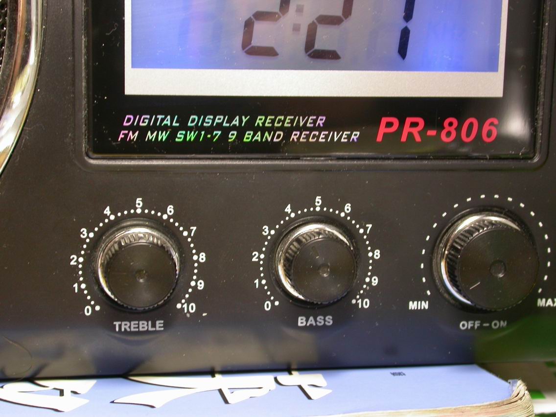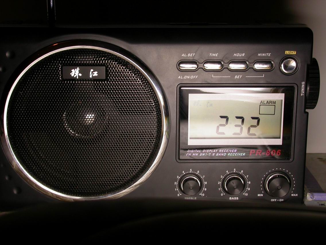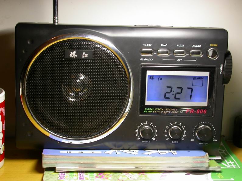 今天在北京天意市场,突然发现这机,让JS拿来试一下,突然感觉眼前一亮,珠江的声音如此之棒,特大口径喇叭,粗量一下,应该是4寸的,设调频,中波和7个短波共9波段,型号是PR--806,JS热情介绍说有超重低音,我笑了笑,仔细一听,有蓬蓬感,味道很是不错,轻轻调节,低音浑厚,高音清澈见底,哈哈,妙,真是太妙了,比BCL2000的声音不知强出多少,市场屏蔽大,中短波表现不好,调频出奇的好,马上让JS把柜台里的9700DX拿来比较一番,发现9700DX能收到的,它都能收到,丝毫不差,掂了掂份量,比BCL2000要重,体积和BCL2000差不多,大家看图片可能我拍的有毛病,看起来小,可是这机其实和BCL体积大小相当,回家后因为德生2000卖了,没法比,1103在办公室,只好和1107比了比,发现调频的灵敏度和1107旗鼓相当,中波没有了干扰,背景很干净,只是灵敏度比1107差很多,且700KHZ以下有轻微啸叫,强台仍然声音巨好.认为中波做的很不好,短波逐个台和1107比,灵敏度高,背景干净,无啸叫,选择性不错,调谐手感很爽,这机总体应该说很不错,缺点是只有交流电源插口,插口太少,无耳机,外接电源,外接天线等等,收听应该说绝对强于BCL2000.让JS拿一台新的,说只有这台样机,无包装盒,无说明书,最后刀子狠狠的砍了下去,130元成交,JS说连运费都赔进去了,爱赔不赔吧,反正便宜才是硬道理,占没占便宜俺也不知道.有机会朋友们听听,这机还真不错.