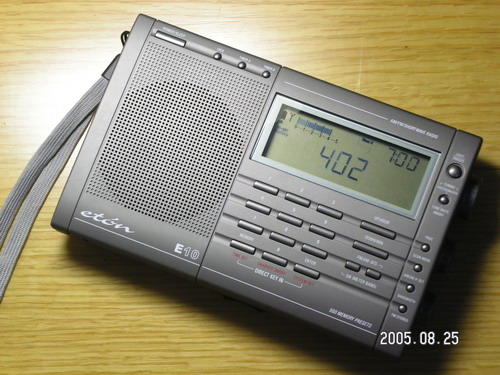 第五式,短波.比较了大家常听的一些电台如德广的6225,15355,17660;法广的9805,12075;以及梵蒂纲的15455,6020,17515,还有小电台塔什干电台5060;塞尔维亚和黑山电台的9580,至于VOA,ZY亚洲就不说了,调到哪里都会碰到,就是被压制的很厉害.对于像德广,法广这样的大台而言,两机都用自带天线接收,还是一样E10比550多一个信号指示,听感还是E10好,不过在信号有衰落时由于550喇叭对于中频的反应敏感似乎更清晰一点.实在也是鸡蛋里挑骨头.但是对于弱台,两机的自代天线收起来都困难!但是为了减少外接天线的不确定性的影响,还是坚持用自带天线接收,为此我爬到天台的电梯机房顶上,在黑夜里挥舞着银色的天线,有点横刀立马的感觉.当然收黑山台时在早上,刚一起床就冲出去,站在高出引的对面厨房里的人都纳闷的看我,可惜啊,尽是些上了岁数的男男女女,枉费我摆了半天普式.扯远了,回来说效果,塔什干台真的太弱了,几乎是噪声一片,还夹杂着高端似乎是个印度台的声音,怎么办?简单,打开带宽选择,选窄带接收,干扰明显小了很多,这里有一点说明,就是似乎感觉上E10的窄带带宽控制的比550好,在切换前后邻频干扰的强度差别比550明显一些.启动窄带后E10可以隐约听到有个女声在播新闻,内容实在难以分辨,偶尔几个字可闻.550仍然是噪声一片,偶尔感到有人在说话,就更别提什么内容了.至于黑山台,信号略好,以E10基本可以分辨内容,而550仍然是勉强听到有人说话,内容难辨.由此可见在短波的灵敏度上,E10明显强于550,而且E10的选择性也略好于550,只是由于E10声音蓬,有些本可以听清的内容变的含糊了,由此看来想抓弱台作DX的同好们,蓬蓬声未必是件好事.而听强台的却可以尽情享受那种优美浑厚的声音,这也是为什么在短波收发信机上为什么采用专用的喇叭,针对音频作加强的原因了.