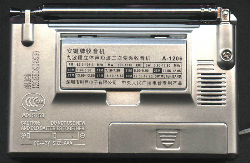 A1206是安键2005年推出的一款超小型短波二次变频指针收音机,该机机身小巧轻薄,灵敏度高,外观精美,是一款优秀的袖珍式收音机。在7月17号收到该机后(机身号:120650606630),进行了试听及和同档次产品对比分析,下面是我的一点试听感受。