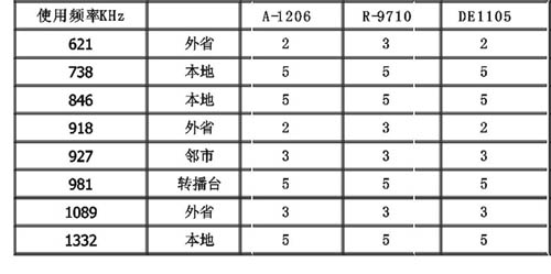 由于近20年来环境的变化,特别是严重的电磁干扰,使得现在中波接收效果越来越不好,像过去可以收到大量外地台的情况已成为历史,不过对于中波接收的好坏可以反映出收音机的性能,因此中波也是不可缺少的测试项目,选择了几个本地强台和几个外地弱台。见表2