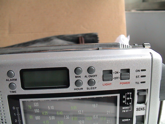 右上部最左是定时和时间上下两个按钮,右方就是小液晶了,只能显示时间,不爽。再右是分钟和小时两个时间设置按钮,再右是定时开关和睡眠开关两个按钮,再右就是夜间照明的开关,再右就是收音机的开关了。最右边是ON/ST/TU三个LED指示灯了。