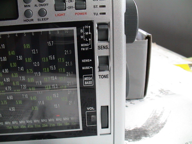 紧下面就是三档灵敏度开关了,同时也是单声道和立体声的开关。再下面就是新闻音质和音乐(超重低音)音质开关。最下面是带数字提示的音量调节钮了。