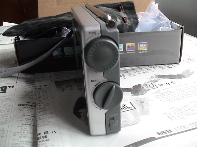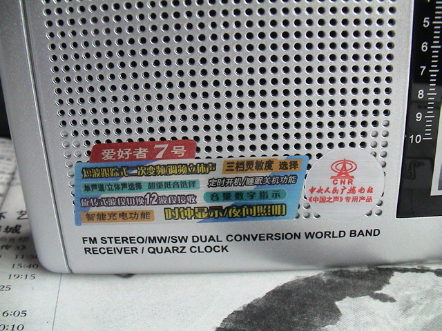 左下角是德劲公司的机标了。写明爱好者7号,短波跟踪式二次变频立体声、在档灵敏度选择、单声道/立体声选择、超重低音选择、定时开机/睡眠关机功能、旋转式波段切换12波段接收、音量数字提示、智能充电功能、时钟显示/夜间照明等收音机特点,右方是中央人民广播电台《中国之声》专用产品的圆标,很不顺眼!
