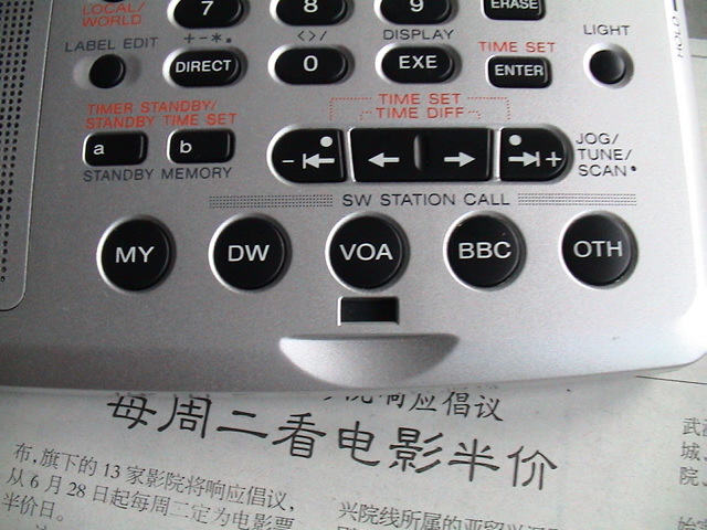 一是她有一个ROM,据说SONY定期更新,上面存有DW、VOA、BBC和OTH等台的全部频率。OTH实际上包括7个不常用的台的频率,让你选择一个。我称她们是懒人键,实际上是一键通。按一下,可以直接切换到这几个台上,再按一下,可以自动搜索存储的频率,自动跳过没有信号的台或是弱台,播出强台。太方便我这种懒人了。