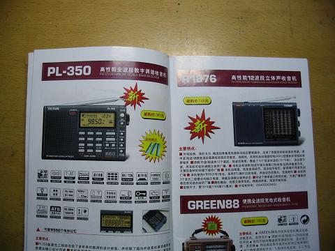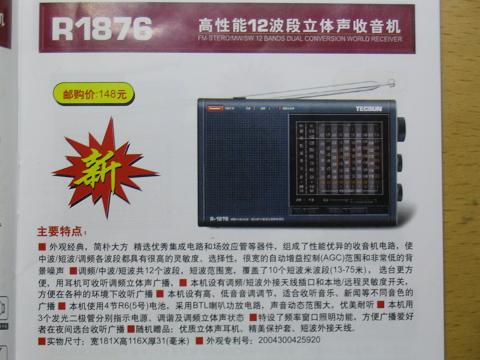 2、当我翻到介绍PL350的那一页,在对页赫然出现了一台指针调谐机——乍一看该机子外观很像PL350,尤其那圆滑的棱边,和PL350如出一辙。仔细一看它又拥有PL550的布局——左上角处的电源开关和右侧的三个旋纽,以及的9700DX那样的调谐指示面板。一看产品型号是R1876,好像德生官方主页上还未曾公布它的相关资料。仔细阅读了一下它的产品介绍,很遗憾的是里面没有提及二次变频的字眼,看来是没用上这项技术了。不过既然它是集合了众多机子的优点又由于是在PL350稍晚些推出,应该是共用了PL350的电子元件。PL350性能之优秀大家有目共睹,所谓“虎父无犬子”,相信R1876的短波效果也不会让人失望。R1876的实物尺寸和9700DX一模一样,同为宽181高116厚31(毫米),用的也是四节电池,拥有和9700DX同样大小的喇叭,输出功率是250毫瓦。9700DX的喇叭音质为不少网友所津津乐道,而R1876的数据和9700DX如此相像不禁让人充满期待。R1876的邮购价是148元,而9700DX的邮购价是198元,在代理商处9700DX 168元可购进,如此推算德生的这款新品R1876仅需120 元甚至更低的价格便可买到。如果R1876的接收效果和9700DX不相上下,但又没有后者为人所诟病的啸叫,那无疑将取代9700DX成为德生最具性价比的收音机。