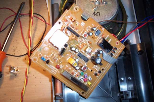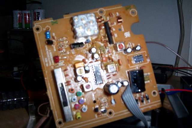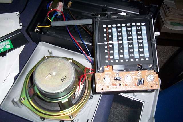 拆开祥察此机,整机机械结构还算令人满意,整个机芯浑然一体,偌大的扬声器给人信心,中波磁棒长达18厘米,再拆开线路板瞧,本机的中心器件是三洋著名的收音机芯片LA1260,FM高放处理使用东芝TA7358,而音频功放则为UTC2822M,工作于BTL方式,上面加了一个卡焊在线路板上的简易散热器,不愧为知名品牌厂家,散热器与UTC2822M之间涂有厚厚的散热硅脂,保证了UTC2822M的良好散热,但波段开关的周围看到了一堆排列有序的色码电感,看板上标注的文字,对应着短波的各个波段,我没有再详细研究这些色码电感使用于短波的输入回路,还是本振回路,我见过短波高频线路大量使用色码电感的收音机有两个,一个是冒牌的SONY收音机,一个是小地摊上买的15元一个的调频调幅多波段收音机,我不知道这些没有屏蔽的色码电感的使用是否是收音机技术的新工艺?看到805中的这些色码电感,我心里开始有了失望的感觉了...