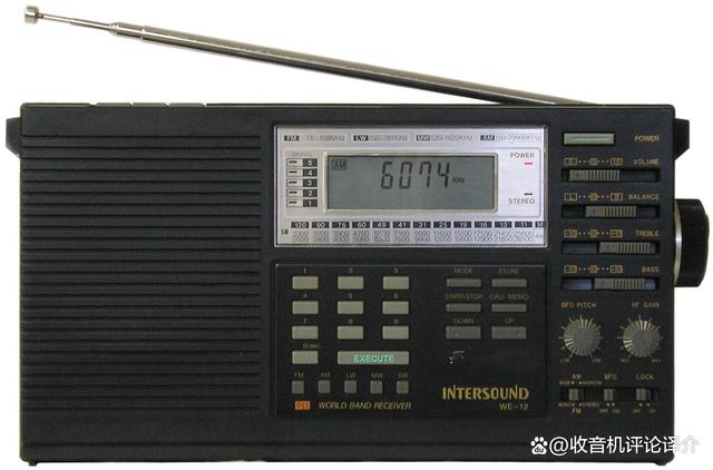 这款收音机前面板的右上角设有电源开关,它的下方有4个滑动开关,分别是音量调节、立体声平衡、高音和低音调节。这四个开关的下方有两个旋钮,左侧为用于单边带的拍频旋钮,右侧为射频增益控制旋钮,注意:只有将射频增益控制旋钮向右拧到最大,才能保证正常的接收效果。