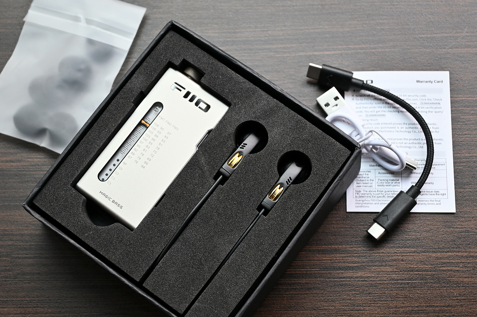 内容物方面,除了纸质品和收音机本体外,另随机附赠有USB C-C线(小尾巴)、充电线(白色),以及标配的JF11平头塞,塞头金色双笛管造型,也算是对时代经典的致敬吧。
