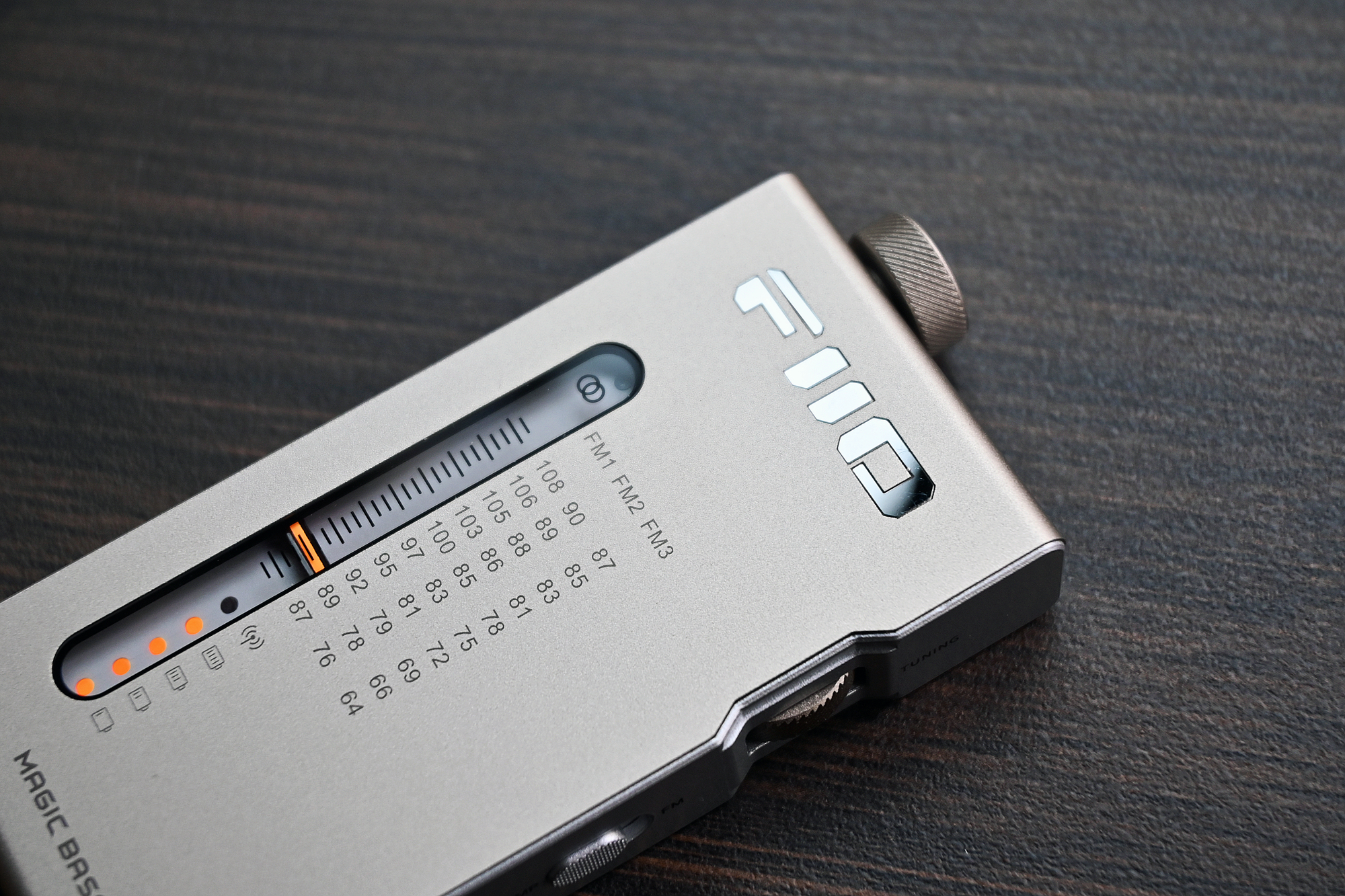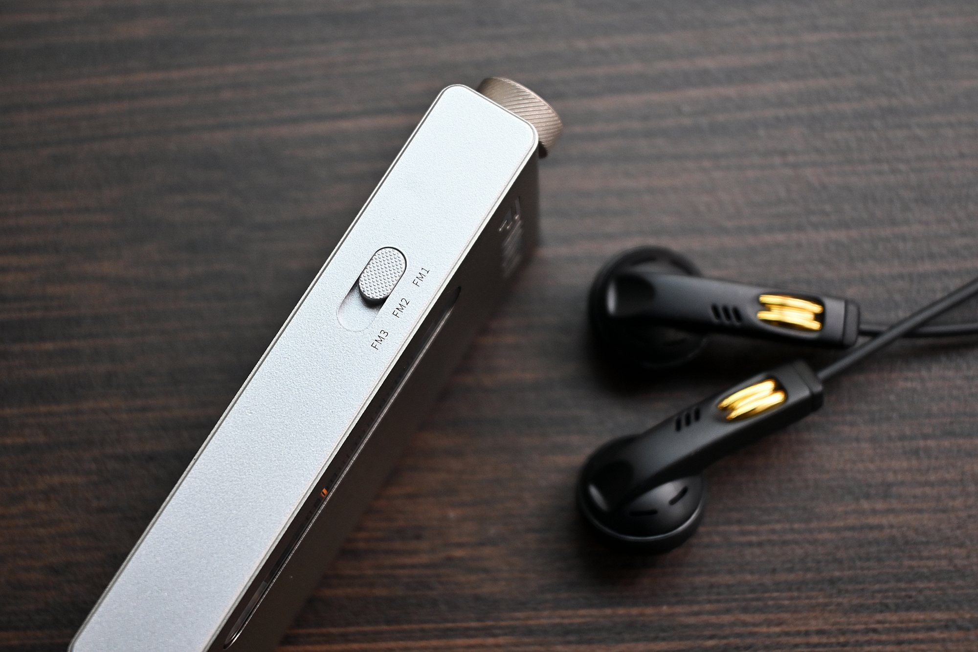 顶部的调旋(兼顾开关机与音量调节)和3.5mm单端耳机插孔,底部则是Type-C充电口,支持USB DAC(小尾巴)。RR11支持64~108MHZ FM频段(并不支持AM中波段),包括国内外FM信号及FM校园广播都可以覆盖到,我们可以在FM1/2/3三个频段间自如切换,分别代表了64-87MHz(FM3校园广播)、76-90MHz(FM2,常听的电台,如新闻综合、交通音乐等)。