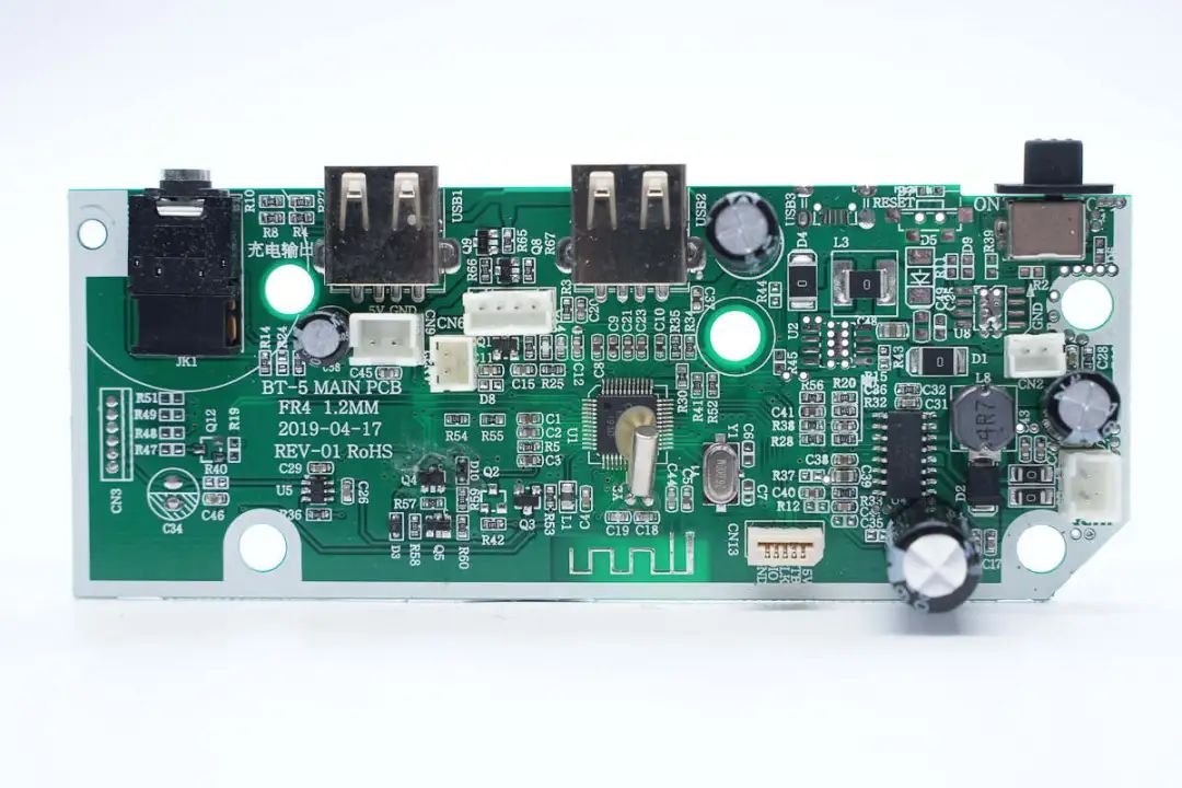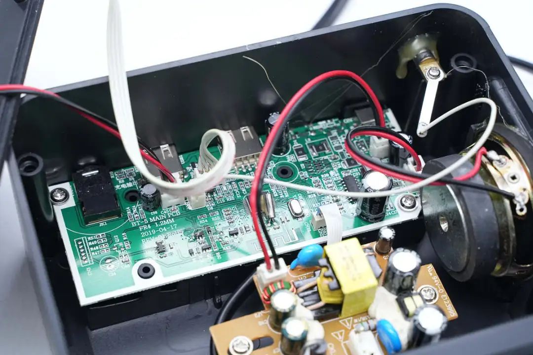 音箱主板正面一览,左侧设有3.5mm音频输入端子,依次焊接用于充电输出的USB-A母座,用于连接U盘的USB-A母座,扬声器开关。在中间位置设有主控芯片,下方为印刷蓝牙天线,右侧为扬声器功放。