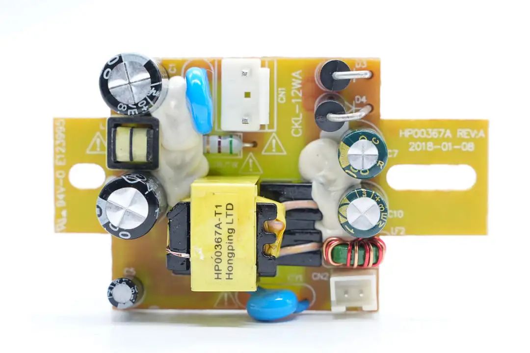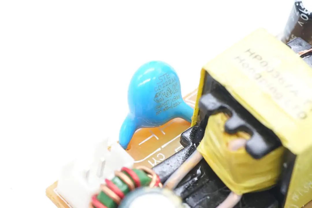 电源小板正面一览,上方焊接电源输入插座,下方焊接保险电阻。在插座左侧焊接压敏电阻,高压滤波电容和共模电感。下方焊接变压器。右侧焊接整流二极管,滤波电容,滤波电感和连接器,底部焊接蓝色Y电容。