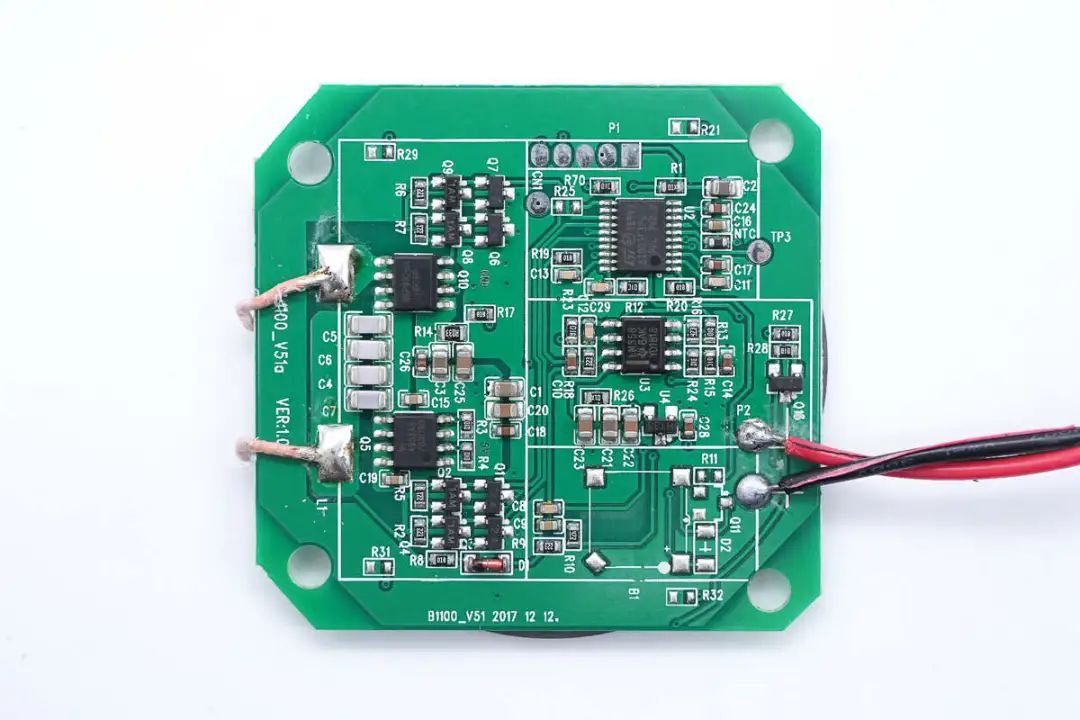 无线充电小板左侧焊接NPO谐振电容和无线充电功率管,右上角焊接MCU和双运放。