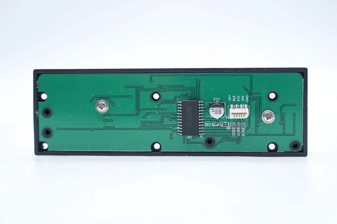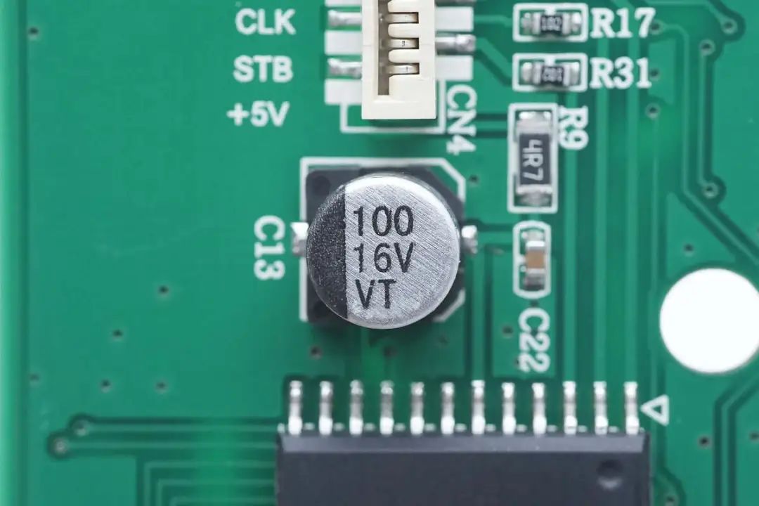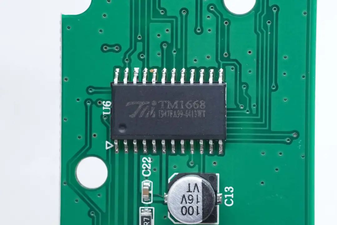 LED驱动芯片来自TM天微,型号TM1668,是一颗具备键盘扫描接口的LED控制芯片,支持10*7或13*4配置,具备良好的稳定性和抗干扰能力,采用SOP24封装。