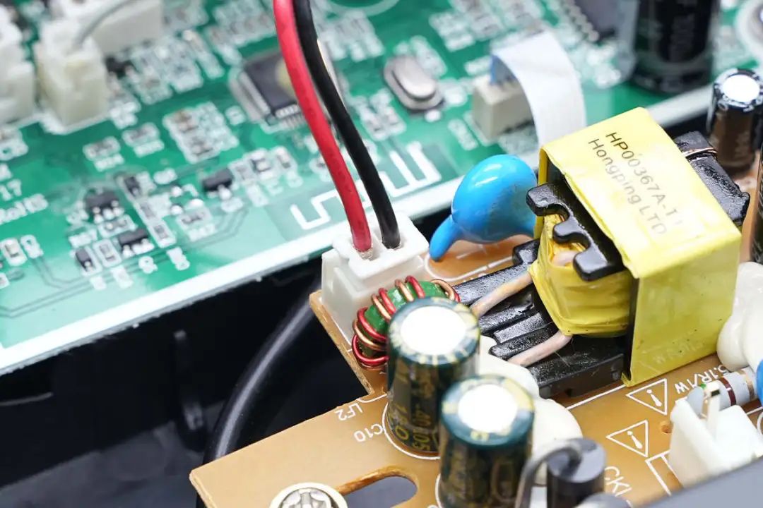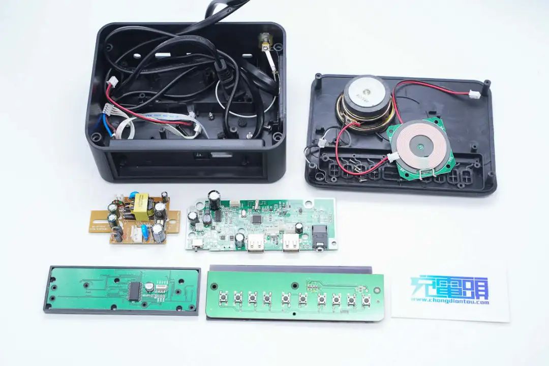 充电头网通过拆解了解到,RCA钟控收音机内部采用独立的功能模块组成,各个模块通过导线和连接器连接,便于组装。其中电源模块采用赛威科技原边反馈方案,主板采用中科蓝讯主控芯片实现蓝牙连接和时钟走时等功能,无线充电模块采用MCU方案。内部设计紧凑,做工扎实。