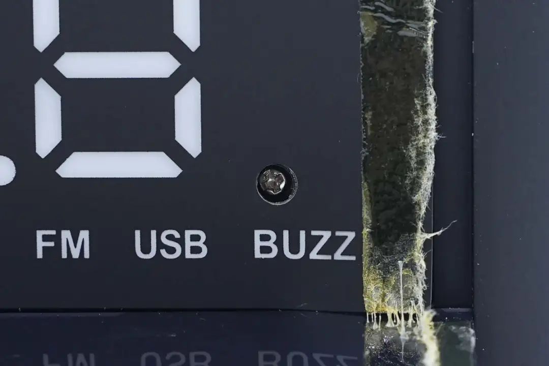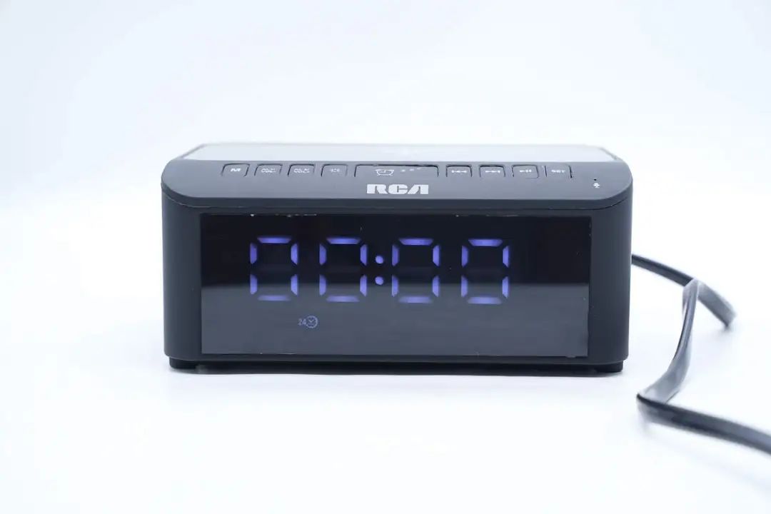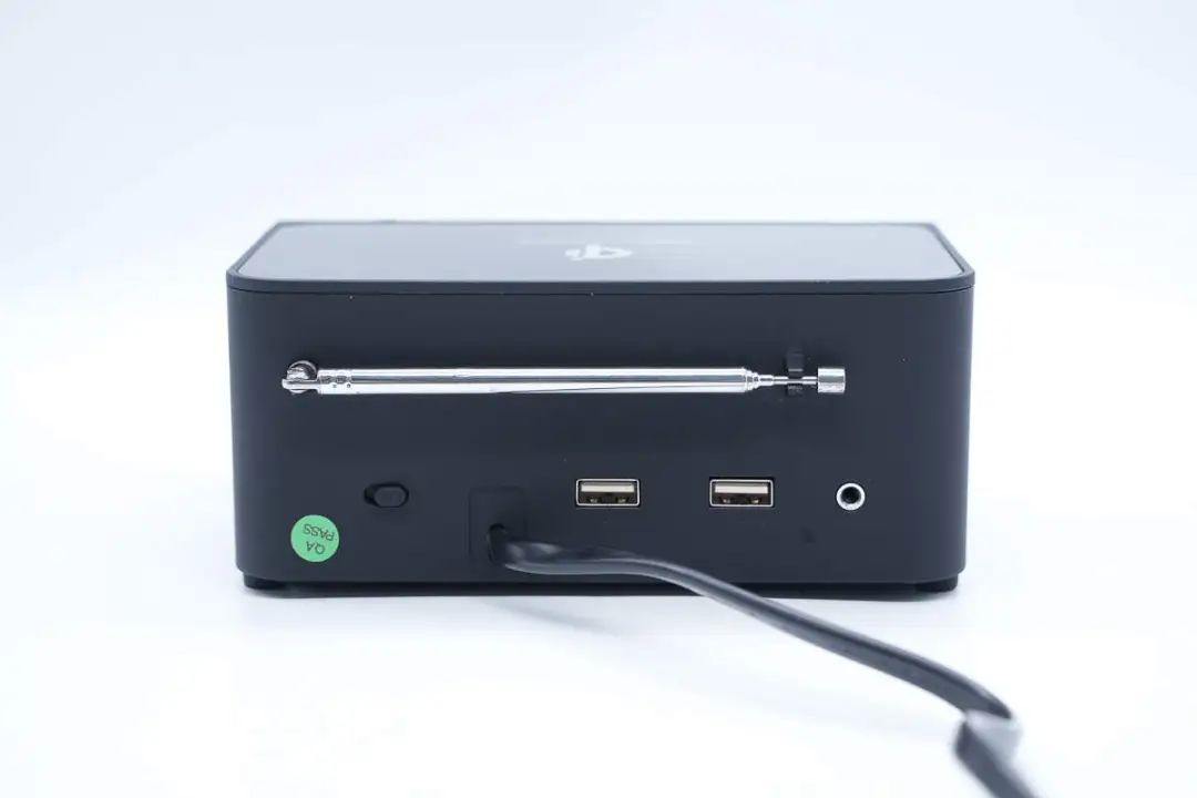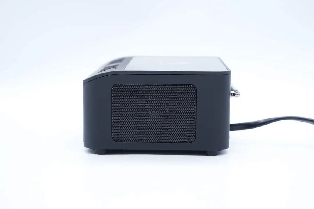 钟控收音机侧面屏幕特写,接通电源显示时钟。