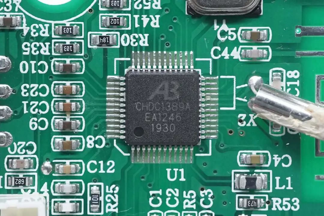 音箱主控芯片来自中科蓝讯,丝印CHDC1389A,用于蓝牙连接,屏幕显示和USB播放功能。