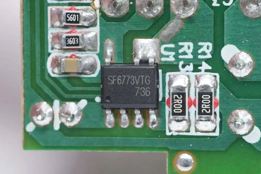 初级主控芯片来自SiFirst赛威科技,型号SF6773V,芯片内部集成650V开关管,输出功率为13W。芯片支持线损补偿,具备逐周期电流限制,具备输出过电压保护,供电欠压闭锁,过电压保护和钳位功能,采用SOP7封装。