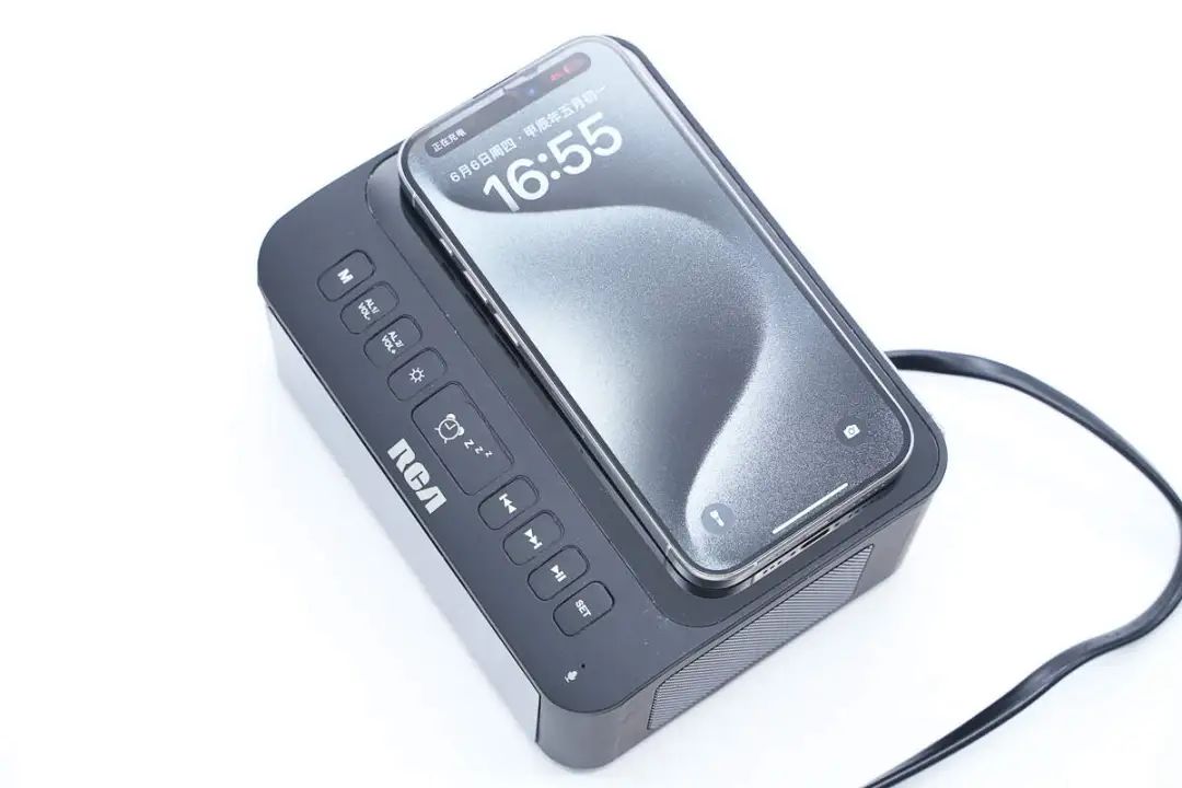 将iPhone 15 Pro手机放置在收音机上面,能够正常无线充电。