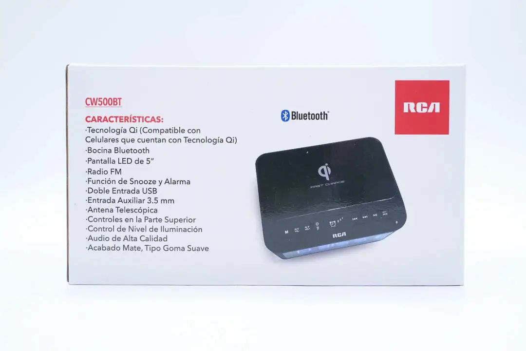 RCA钟控收音机包装盒采用西班牙语印刷,正面印有产品型号,Qi无线充电、蓝牙音箱、钟控收音机,产品外观图和产品支持的功能。