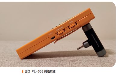 此机的外观,跟我心里想的不一样。我以为能做成对讲机的形状,属于比较厚的类型,实际上此机做得非常薄,非常窄,整体的形状就像粉饼盒一样,比粉饼盒还要小,比口红大一些。PL-368侧边按键如图2所示,按键功能一个也不少,甚至比PL-330还多了一个功能。PL-330的同步检波功能,需要按住单边带按键,才会启用同步检波;而PL-368把同步检波做成了单独的按键。购买此机需要注意,因为体积太小,按键更小,如果手大一点,要用指尖去操作按键。我想起来有一个广告词:“触碰指尖的温度。”这句广告用在PL-368上很合适,叫作“触碰指尖的按键。”