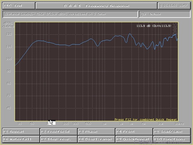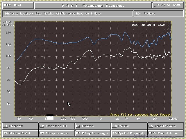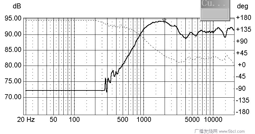 下图是一只全频喇叭(注意不是801配套音箱的喇叭)在无箱体时测量的频响曲线,通过这个曲线可以看到,由于“声短路”现象的存在,在500Hz以下开始往下掉,在低频感受明显的100Hz左右下跌超过了10dB: