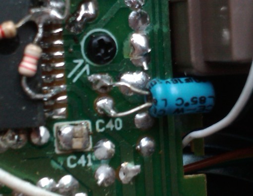 很快就发现,IC的23脚至24脚的偶合电容是一个小小的瓷片电容,在刻度盘下,容量标示不便观察,估计在1微法以下.