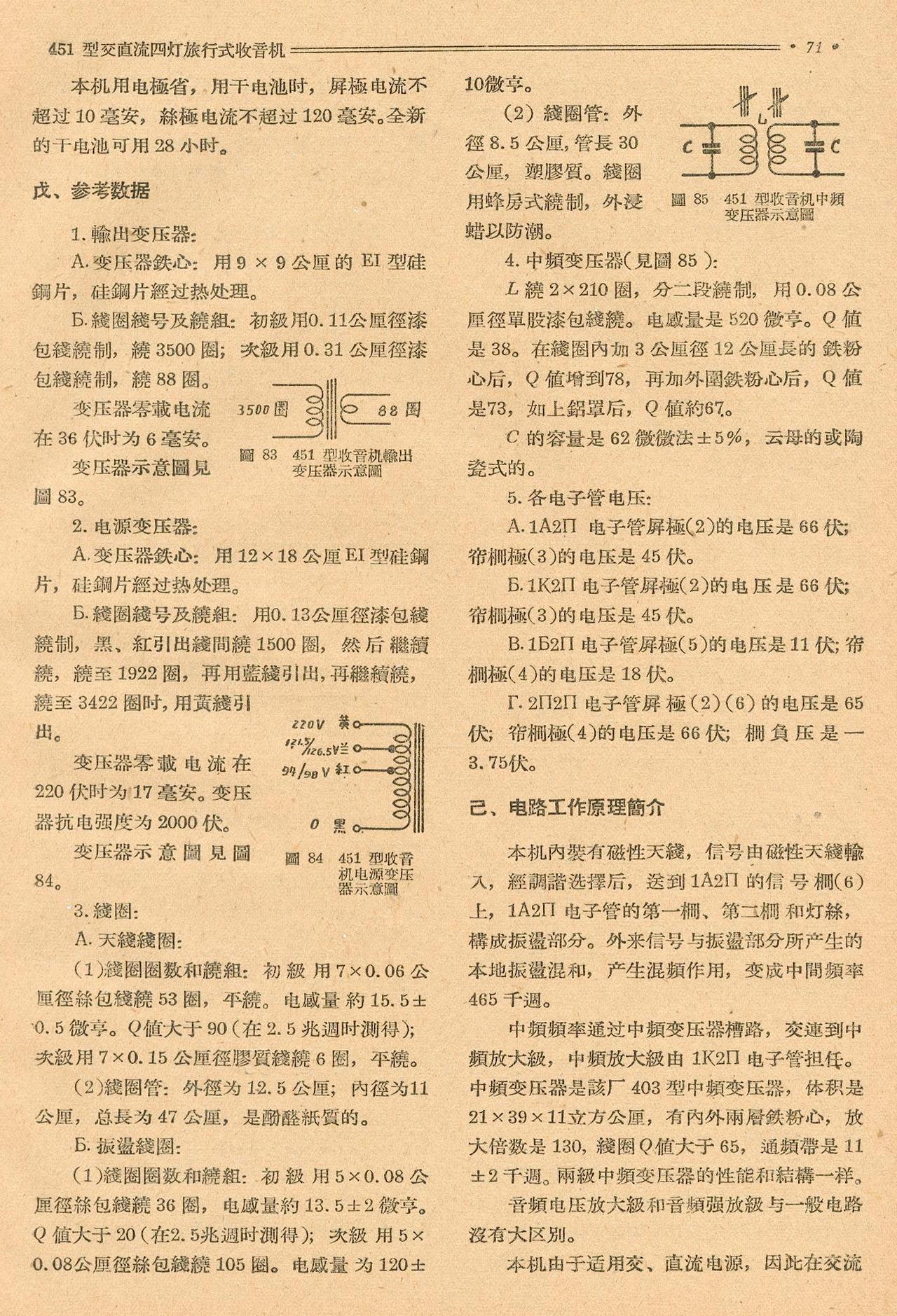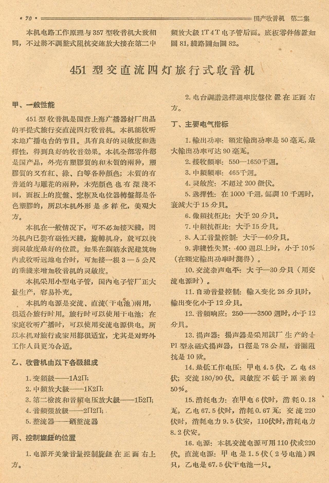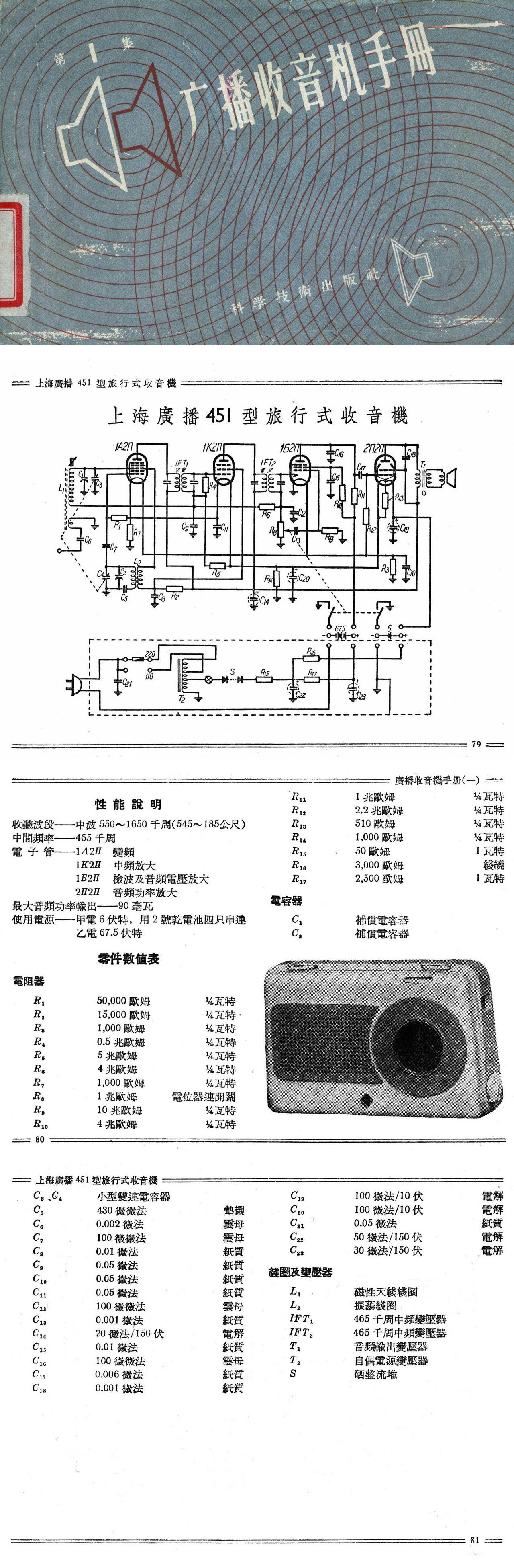 《广播收音机手册》介绍,注意外观图,与《人民日报》登载的图片一样,与常见的塑壳451有明显区别,猜测是最初版本,机身左侧上部的插孔和下部的旋钮不知何用?请各位老师赐教。