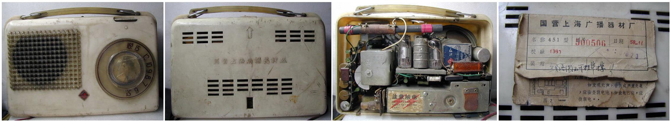 点击打开连接)网站介绍,上海451是在1957年2月——1958年研制成功作为国庆十周年献礼的;《人民日报》于1958年3月1日新产品介绍专栏发布了上海451试制成功并投产的消息;《无线电》杂志1958年4月号也介绍了上海451;1958年3月《无线电技术》(内部发行)创刊号封面刊登了雕花版上海451的大幅照片;而《国产广播收音机手册》一书介绍上海451生产日期是1958年5月,比此书更早出版的另一本小册子《广播收音机手册》(1958年7月出版,应是建国后第一本收音机线路图集)也有该机介绍,不过没有生产时间等信息。综上,基本可以推测:上海451可能是在1957年下半年试制了参展样机,1958年3月产品定型并试生产,1958年5月正式投产、推向市场。其间,产品外观、结构(尤其是塑壳的)都有比较明显的变化,详见下边的图片介绍。在1958年11月底召开的第一届全国收音机观摩评比会议上,451以其美观小巧的外壳设计,良好的高、低温和潮湿可靠性试验结果获得广泛好评,同时也被指出售价偏高。在1958年底到1959年初,上广电推出了451的升级产品452。至于上海451系列机到底生产到什么时候,总计生产了多少台,我就没有什么资料了。该机型现今的存世量不多,首先当时该机价格很贵(多处资料提及),远非一般人购买力可及,不会有很大产量,加之因体积小很易丢失损坏,多为野外作业人员选用,保存下来就更难了,于是造成了现在一机难求的局面。