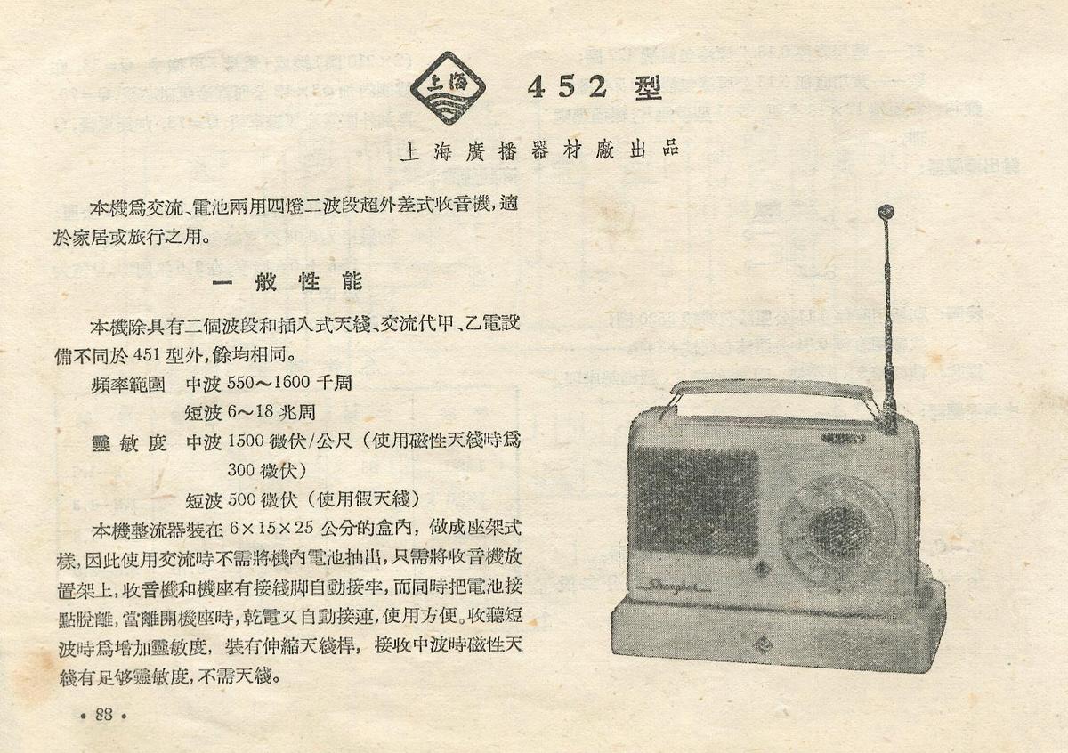 《国产广播收音机手册》介绍,封面最上部是上海452。