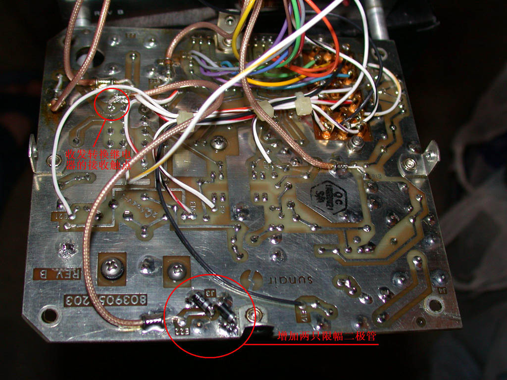9. 将射频检测器板(1A5A4)的插座J3的引线E22从1A5A3板上的位置改到本板的收发转换继电器的接收触点上。同时并联两只倒相的二极管IN4004作为限幅器。