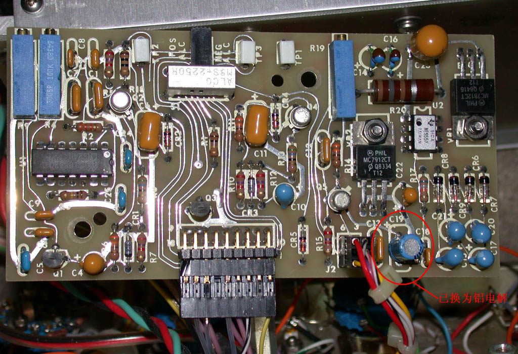 另外还有一块可能是1KW功放的控制板上也有一个钽电容C19损坏造成接上此板后就不能开机的(12V电源自动保护)故障,更换该电容后机器恢复正常。