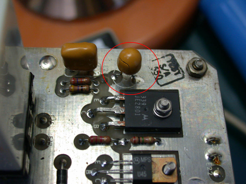 电源模块修好后,接上电源仍然总烧28V保险,看来此路还有故障。经过逐级检查分析终于定位于射频检测器板(1A5A4)上的一个钽电容击穿,看来第一次烧机的烟雾和糊味均来源于此。在后面的检修过程中大家会看到这种机器的钽电容在机器故障中占了较大比例,可见早期的钽电容可靠性还有待提高的。
