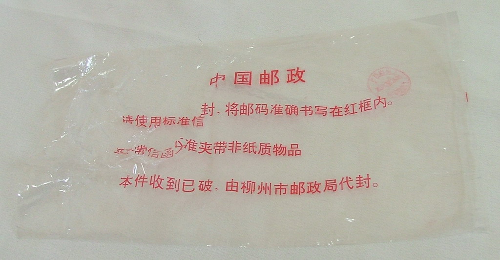 再看下面这一柳州邮政的塑料纸,也就是说柳州邮政局收到这信封时已破损,才用塑料袋重新包装