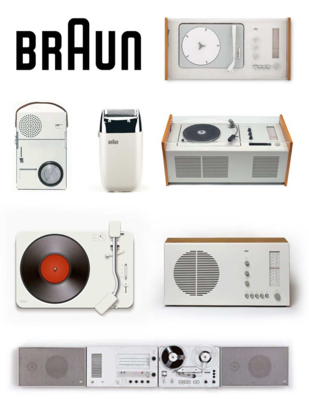 迪特·拉姆斯代表产品,从上至下、从左至右分别为:Radio-Phonograph;TP1 便携式电唱机;剃须刀;SK 4 无线电留声机,被英国人戏称为「白雪公主的棺材」;PS2 立体声唱机;RT 20 tischsuper 收音机;L450 平板扬声器、TG 60 盘式录音机和 TS 45 控制器