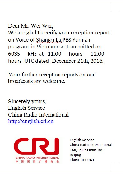 收到云南人民广播电台香格里拉之声的eQSL卡 广播发烧网 发布于 2016-12-23 00:00 QSL 终于收到云南人民广播电台香格里拉之声的eQSL卡了,是CRI代为签发的,封面和CRI的QSL卡一样,是少数民族的,然后他们确认了我在昨天的收听报告 #广播 #QSL 文章目录 × 推荐阅读我们在倾听:收听澳洲CVC中文电台成功获取国内中波电台QSL收听证明的方法初探获得中央人民广播电台QSL卡的秘籍国际广播电台地址名录(1)国际广播电台地址名录(2)WWVH的QSL过程国际广播电台地址名录(6)QSL集装箱[二○○六年一月]我是如何搞定印尼之声华语台QSL收听证明卡的dxman羊年第二波:2月至6月间的26枚QSL 上一篇 川渝广播爱好者2016年度迎新年聚会 下一篇 出色的德生Q3收录机