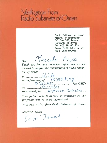 Radio Oman 2003.03.08 1430 UTC, 15140 kHz, Thumrait, 100kW 寄递日:03.19-03.30 卡片图案:阿曼国徽、阿曼概况、电台内外景