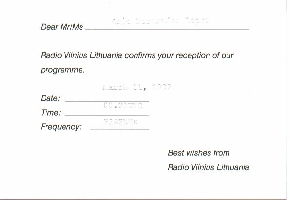Radio Vilnius 2003.03.03, 0030 UTC, 7325 kHz, Sitkunai, 100 kW 寄递日:03.14 - 03.26 卡片图案:Radio Vilnius Lithuania