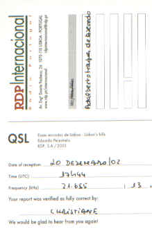 RDP International 2002.12.16 1811-1819 UTC, 13585 kHz, Lisbon-Sao Gabriel, 300 kW 寄递日:02.19 - 02.29 签发官:Isabel Saraiva 卡片图案:油画