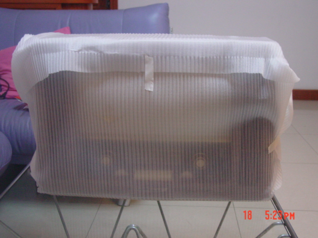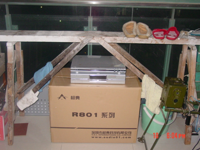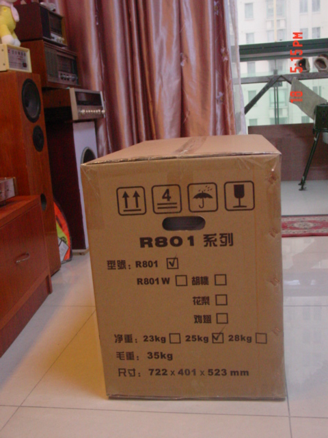 松江华宇提货处经常去的,洞泾路68号。九号地铁到终点站,下了地铁打个的士直奔过去,到那个地方叫司机停在外面等着,一秒钟办好了提货手续,因为是今天刚到的货,都放在外面还没有进仓库涅。我一眼就看到一个暴大暴大的箱子,上书“吴建良”三个黑乎乎的大字儿——我吓傻了,这么大个箱子,显然的士是装不走的了!的士司机看看不对头就想收钱走人,他娘的我一个人怎么弄回去啊!突然我想起了以前在曾总公司看到过R801,不会有这么夸张的,去了包装肯定不会太大的。我和司机说我见过这个东西,不过就是包装箱子大些,拿掉包装箱很小的,一定可以放进车!在华宇提货员工,的士司机和俺三个人的共同努力下,终于把外面一层纸箱卸掉了,我看到司机点了点头,心里的二百斤的石头终于落了地,呵呵呵呵,今天俺终于可以不再这个货场过夜啦!我想起了极典客服的电话,要当场开箱验货的,看到这个提货员帮我费劲的去掉外包装箱,实在不忍再浪费他的力气和时间,直接拉回家完事吧。