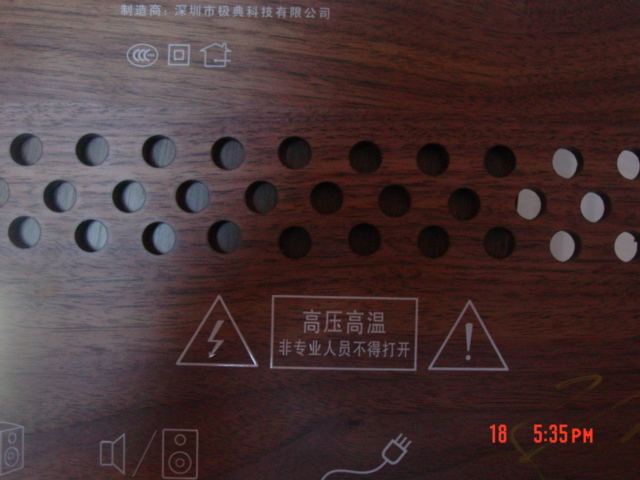 再看背板,我日,“高压高温,非专业人员不得打开!”,但为安全运输记,里面有一块泡沫板必须要打开后盖拿掉的!哈哈,这回俺小菜鸟终于有机会冒充专业人员了!工具箱里操出螺丝刀,后背板上只要看到螺丝就拧出来,终于后背板被俺弄下来了。