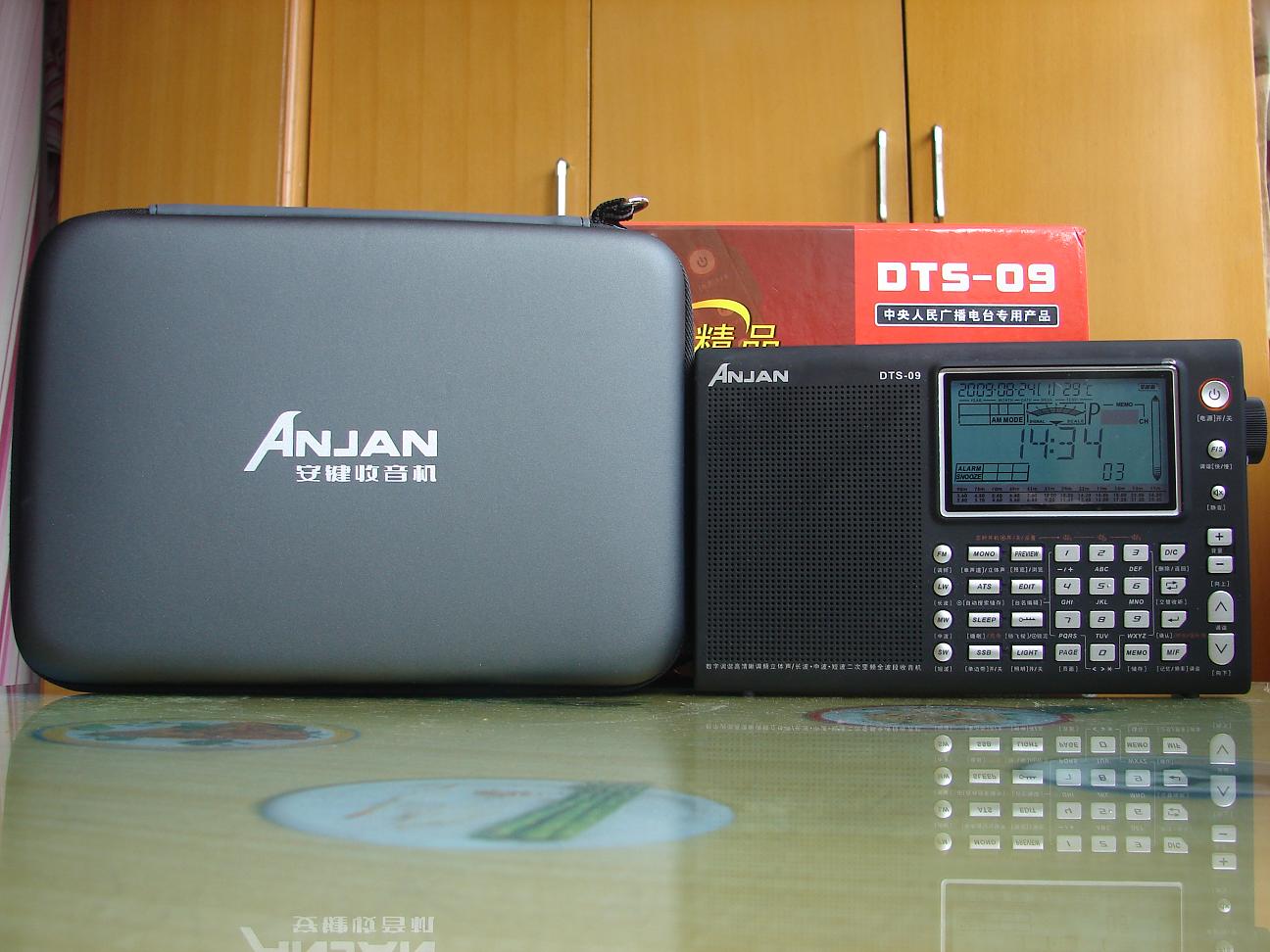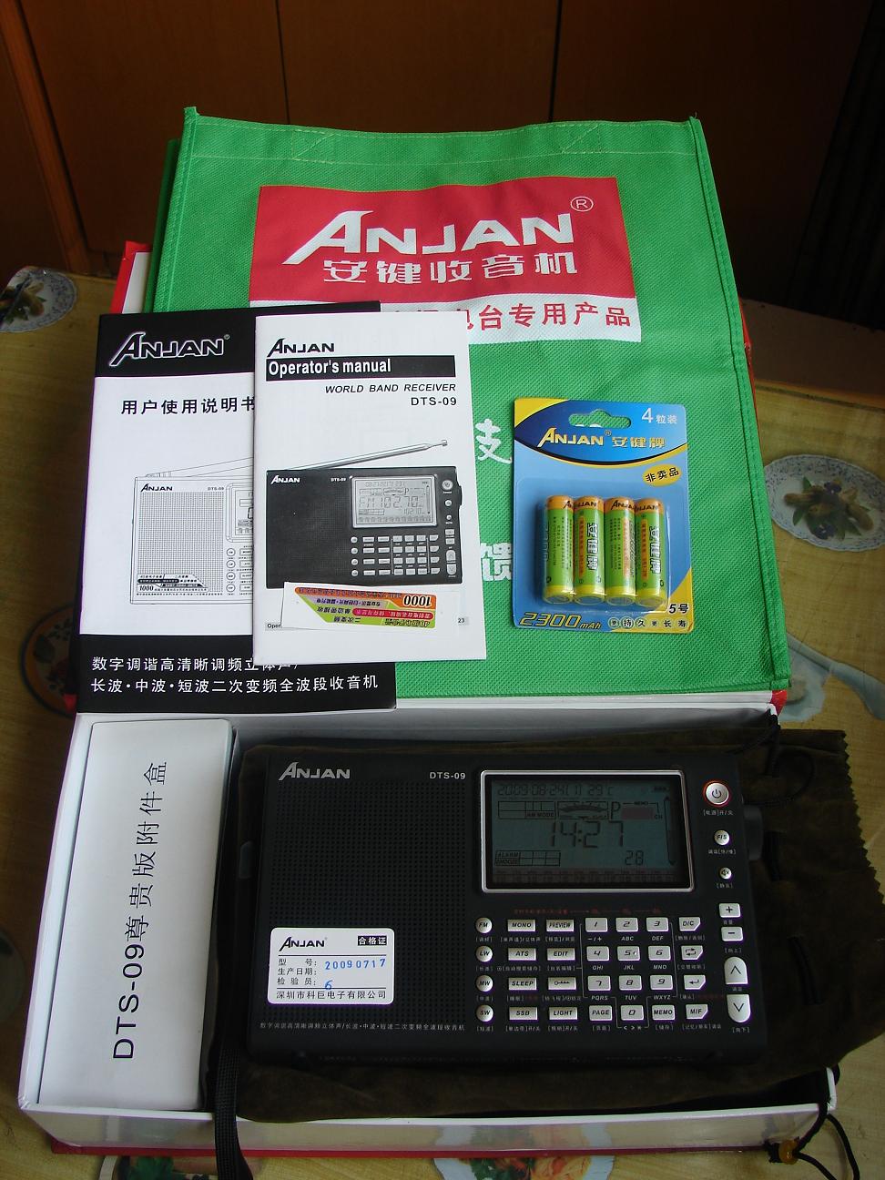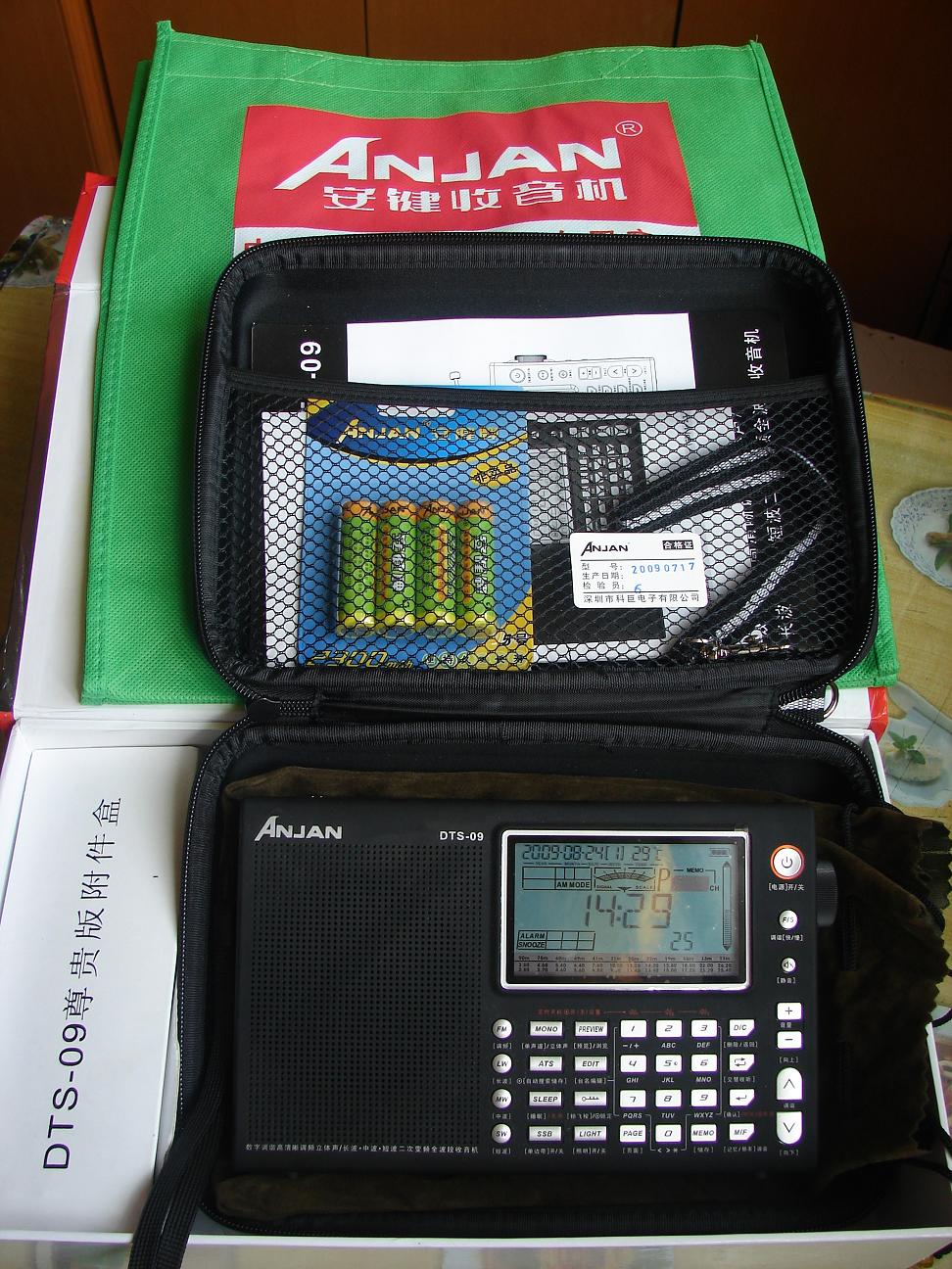 机器的包装很精美,附件也很多,中英文说明书各一本,出奇的是还配给了一只绿色的环保购物袋,机器本身很大,除了软皮的便携袋还配备了软盒保护袋,想的挺周到,试用下感觉接收性能中规中矩,调频不拉天线也能很好的接收本地信号,功能设置完备,SSB单边带接收,多功能飞梭,线路输出输入,电池盖板采用和德劲一样的一体式,可有效防止遗失,高级数调机该有的都有,给人留下深刻印象的是它的操作便捷性,中文面板,特别是设有静音键和回听键,很实用,显示屏很大,内容丰富,可编辑电台英文名,有温度显示,场强表使用的是模拟指针,就是白色背光在晚上看可能太淡了些,音质一般,没有PL600和DE1103好,感觉09的音质是清澈型的,没有过多的修饰,吃点亏.总的来说是台缺点和优点都很突出的数调机,不推荐给只想买一台高级数调机的机友,不过广播发烧友还是可以考虑下的,毕竟它的屏幕显示内容和操作性是目前国产机器里最好的.